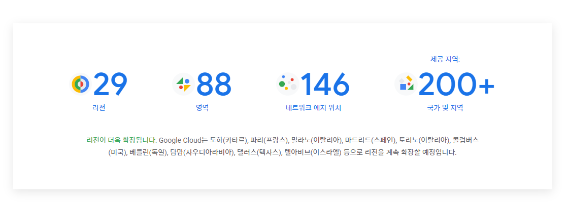 구글은 아래와 같이 리전이 29개, 영역이 88, 네트워크 에지 위치가 146, 서비스 제공지역이 200개의 국가 및 지역이라고 써 있으며, 리전이 더 늘어날 거라고 예측하고 있습니다. 이 말을 해석해보면 데이터센터를 더 많이 짓고 연결한다는 의미라 보면 됩니다.